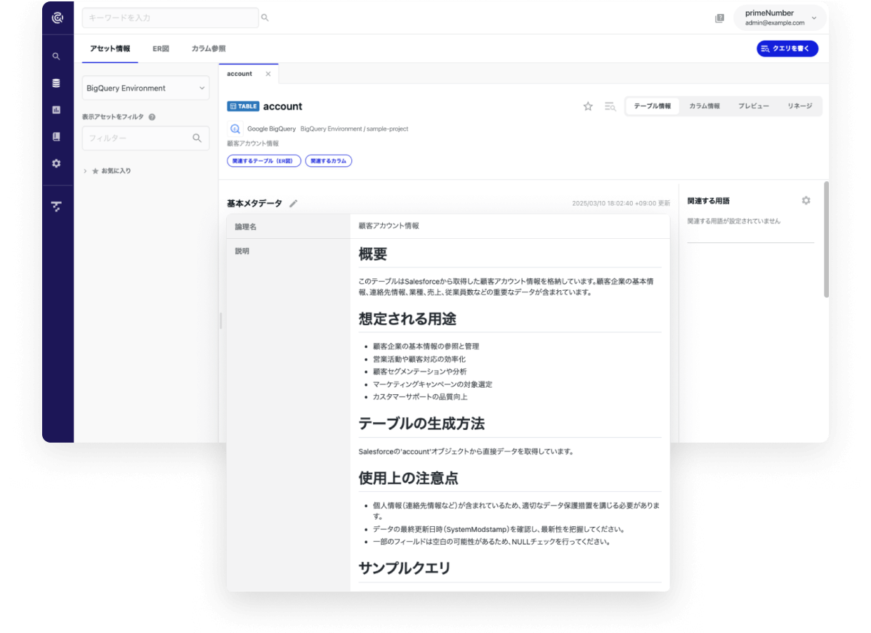 テーブルやカラムのメタデータやスキーマを即座に確認でき、どんなデータが格納されているかプレビューができます。