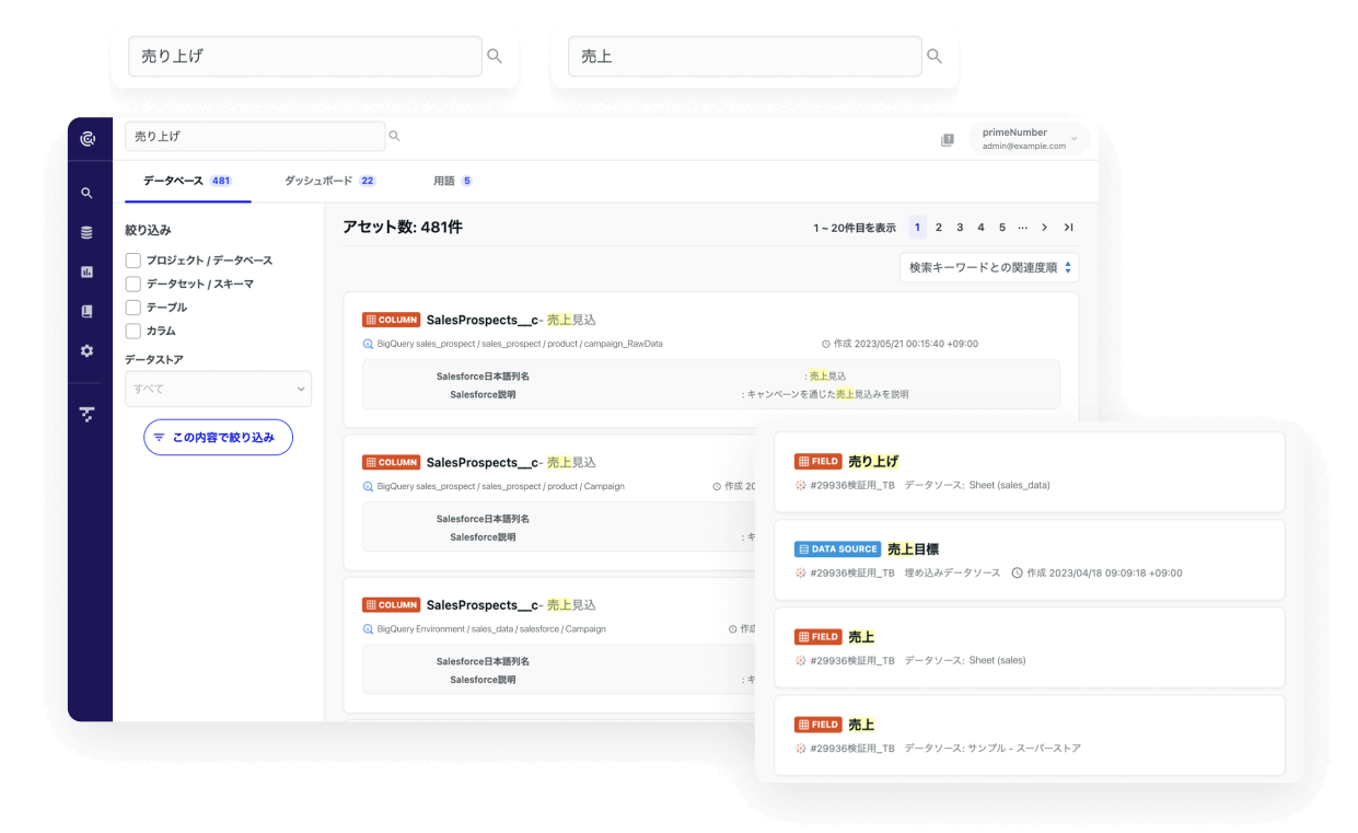 COMETAはあいまい検索にも対応しています。「売上」または「売り上げ」と検索したときに、いずれも同じ検索結果が得られます。直感的な検索で、必要なデータを迅速に特定し、分析に役立てることができます。