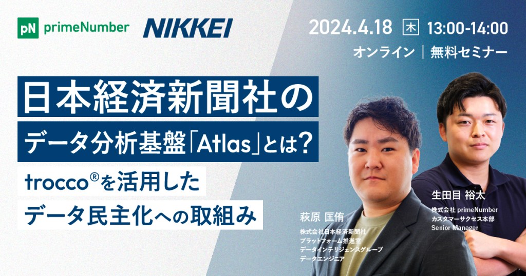 日経電子版など数多くのサービスを展開する日経では、データドリブンな開発・意思決定、データ活用文化の醸成を実現し、持続的な成長を支えていくために、データ分析基盤「Atlas」を内製し運用しています。このセミナーでは Atlas の概要と社内でのデータ利活用シーンのご紹介、また TROCCO を導入し運用をスタートした経緯などを共有します。Atlas では記事データやお客様の行動ログデータなどを含め、1日あたり450GB以上リアルタイムに蓄積し、利活用しています。多量の保有データとともに利活用シーンも多種多様な中、限られたエンジニアリングリソースで最大のパフォーマンスを利用者に提供するための基盤提供の仕組みや、スキル・ナレッジシェアなどデータ利活用の裾野を広げるための取り組みなどもご紹介します。