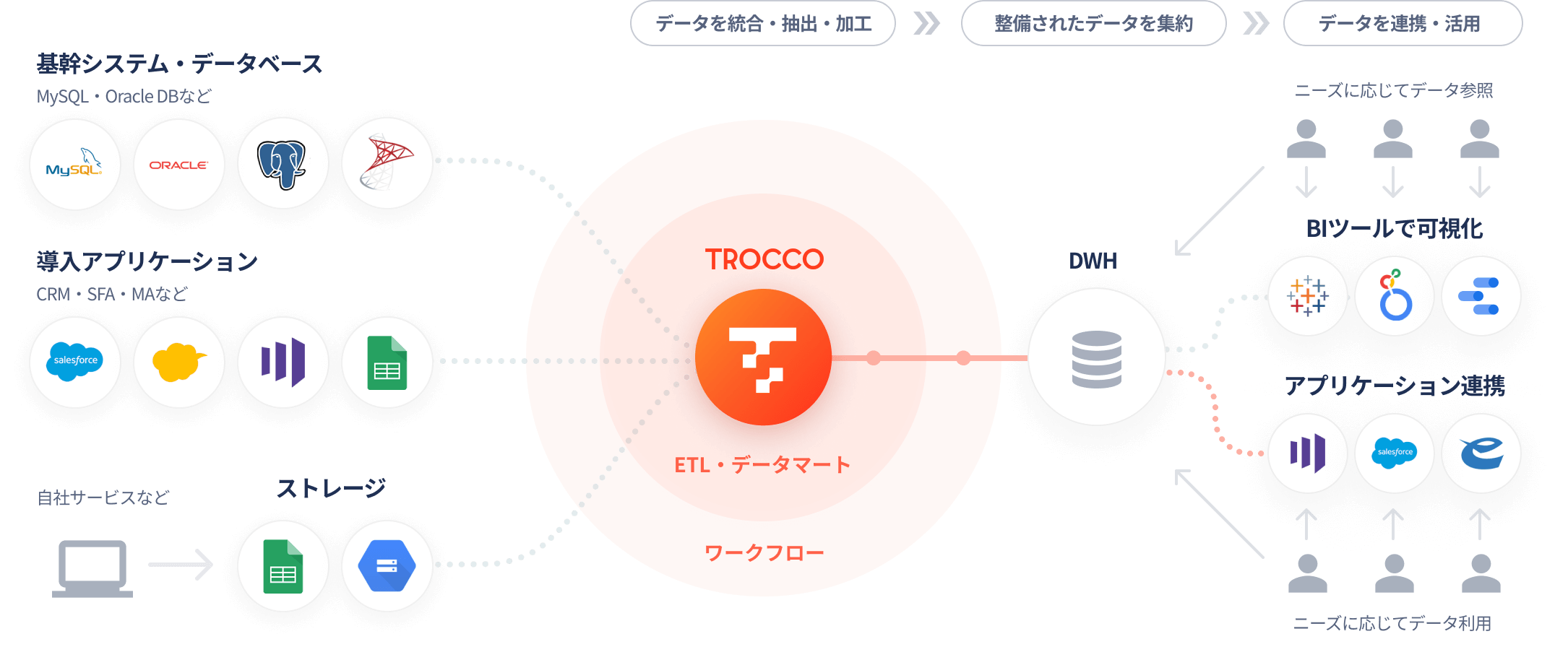 TROCCO®はCRM(Salesforce/kintoneなど)・DWH(Google BigQuery/Snowflake/Amazon Redshiftなど)・DB(MySQL/PostgreSQL/OracleDBなど)など約100種のデータソースと連携し、大容量データも転送可能。