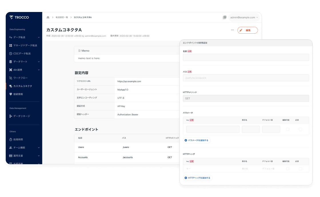 ※ 転送元HTTP・HTTPSはデータ転送設定の作成時に公開APIを提供しているサービスのAPIエンドポイントを指定できるTROCCOの機能です。 Connector Builderは段階的な機能拡充を行っており、一部、転送元HTTP・HTTPSのみで実装可能な接続先があります。 詳しくはお問い合わせください。