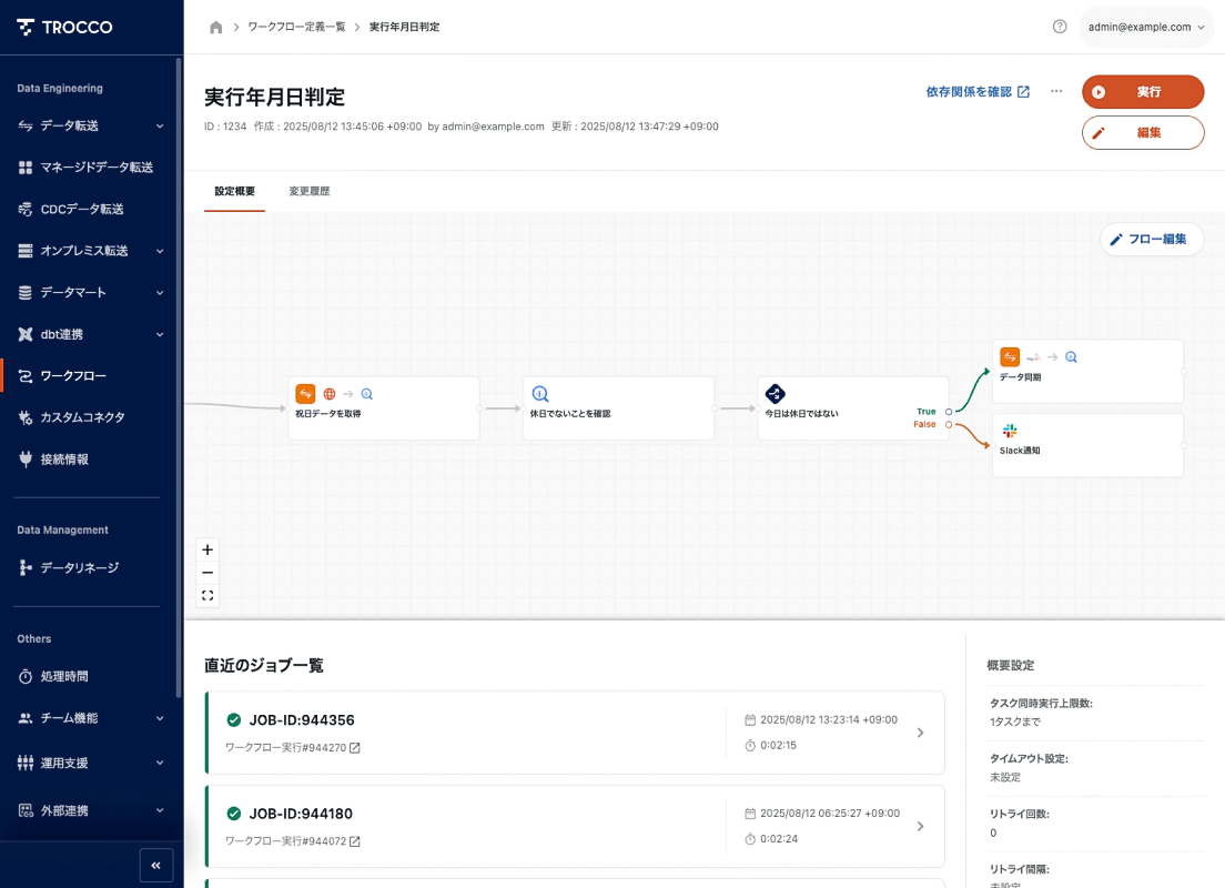 条件分岐、リトライ、並列実行数制御、通知、スケジュール実行を設定できます。